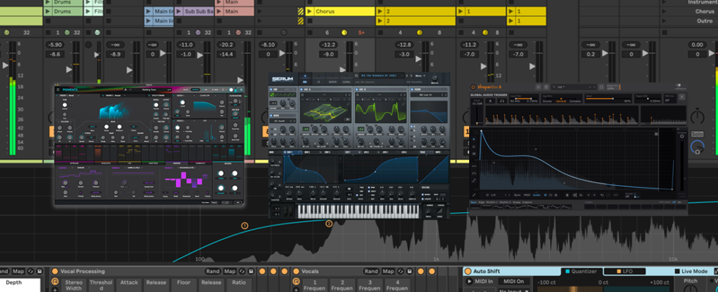 Entre sus herramientas favoritas se encuentran Pigments de Arturia, que utiliza para crear atmósferas con sonidos de pads y voces procesadas con reverb y delay. Serum es su elección para diseñar líneas de bajo con carácter, mientras que Wavetable, incluido en Ableton, le ofrece versatilidad en la síntesis.